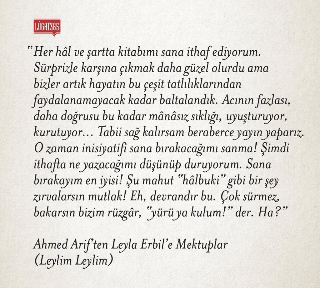 Ahmed arif'in leyla hanım'a yazdığı mektuplardan oluşan bir kitap. Ahmed arif'in en büyük aşkı leyla erbil'dir. Ahmet arif'in leyla erbil'e yazdığı mektupların toplandığı leylim leylim, tezer özlü'nün leyla erbil'e yazdığı mektuplardan oluşan tezer özlü'den leyla erbil'e mektuplar benim keyifle okuduklarım arasında. Sabah gözlerimi sana açarım, akşam uykularımı senden alırım. Leyla erbil'in ona yazdığı mektupların çoğu ise kayıp… ahmet arif, genç yaşlarında aşık oldu leyla erbil'e.
